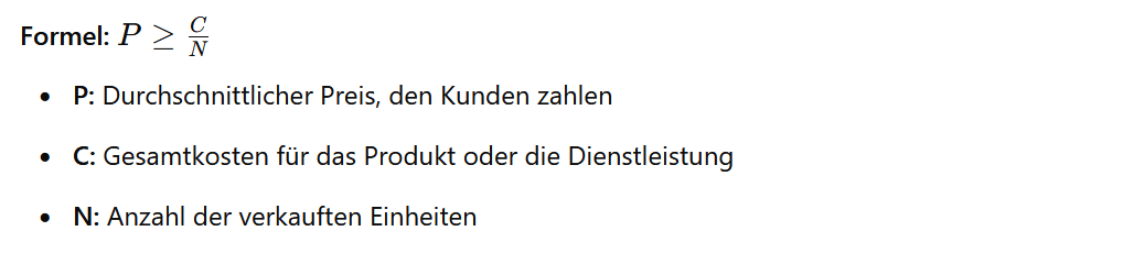 Das bedeutet, dass der durchschnittliche Preis, den die Kunden zahlen, mindestens 10 Euro betragen muss, um die Kosten zu decken. Zahlen die Kunden im Durchschnitt mehr als 10 Euro, macht das Unternehmen Gewinn.