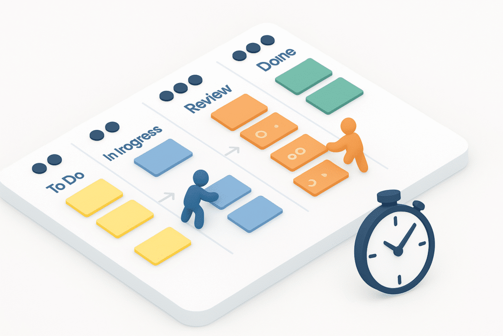 Zeichne dein Kanban-Board: To Do → In Progress → Review → Done. Spalte „In Progress“ bei Bedarf feiner (z. B. „Entwurf“, „Implementierung“, „Test“). -